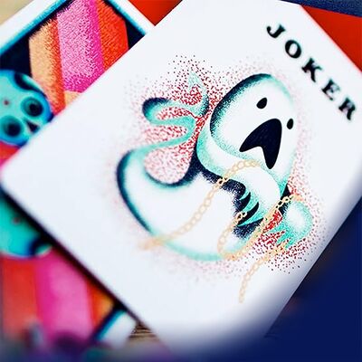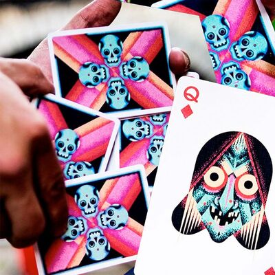 Il mazzo cattura il bagliore delle luci al neon, mentre sfrecciano bruscamente sul design del dorso, completato da un caleidoscopio di teschi.