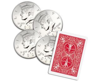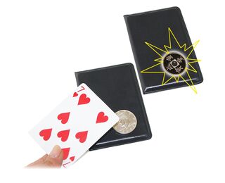 Il mago mostra un piccolo portafoglio contenente una carta da gioco, una moneta da mezzo dollaro e una moneta cinese che ha un buco. Tira fuori la carta e il mezzo dollaro, lasciando la moneta cinese nel portafoglio. Mette il mezzo dollaro sul portafoglio, lo colpisce con la carta e...