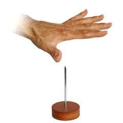 Di fronte a voi sono allineate tre basi di legno una della quali ha un foro al centro. Mostrate un chiodo grande e appuntito e fissatelo, con la punta rivolta verso l’alto, nel foro. Poi coprite le basi con altrettanti bicchieri di carta. Quando vi girate di schiena i bicchieri vengono...